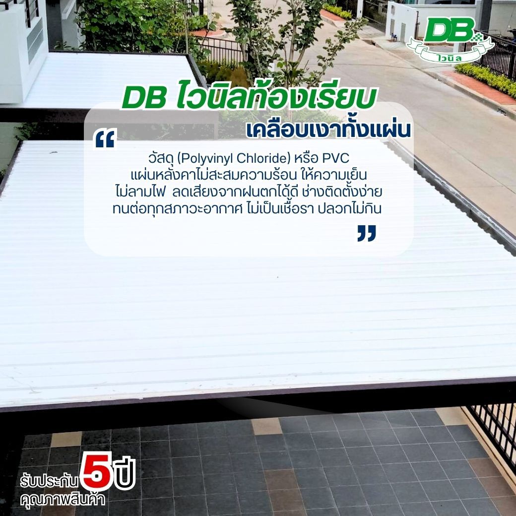แผ่นหลังคาไวนิลลักษณะเป็นหลังคาแบบเข้าลิ้น มีขนาดความหนา 6 มม. ความยาวแผ่นตามพื้นที่ใช้งานไม่มีรอยต่อ นอกจากนี้ยังช่วยเพิ่มความสวยงาม และ ร่มเย็นให้กับบ้าน และด้วยคุณลักษณะการเข้าลิ้นของตัวแผ่นจึงทำให้ง่ายต่อการทำงาน ประหยัดเวลาในการทำงาน สามารถนำมาใช้งานฝ้าเพดาน กันสาด โรงจอดรถ ตกแต่งภายใน และภายนอก